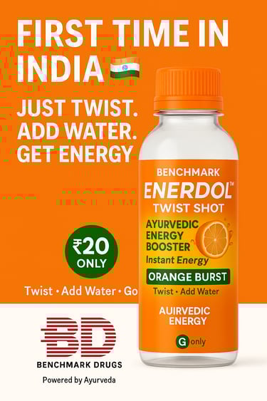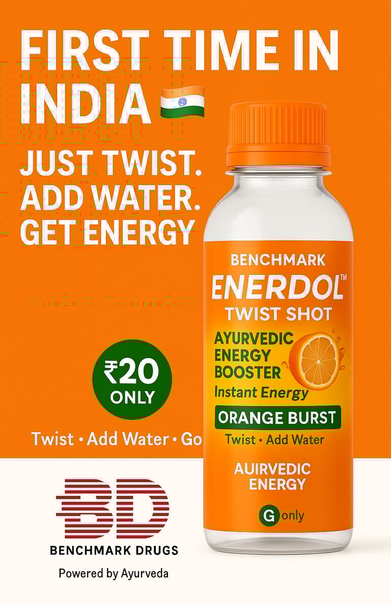 Enerdol™ Twist Shot is a smart, innovative Ayurvedic energy booster designed for today’s fast-moving lifestyle. Powered by Ayurveda and trusted by Benchmark Drugs, it delivers instant energy with a simple twist-cap technology.